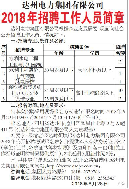 達(dá)州電力集團(tuán)有限公司根據(jù)企業(yè)發(fā)展需要,現(xiàn)面向社會公開招聘工作人員